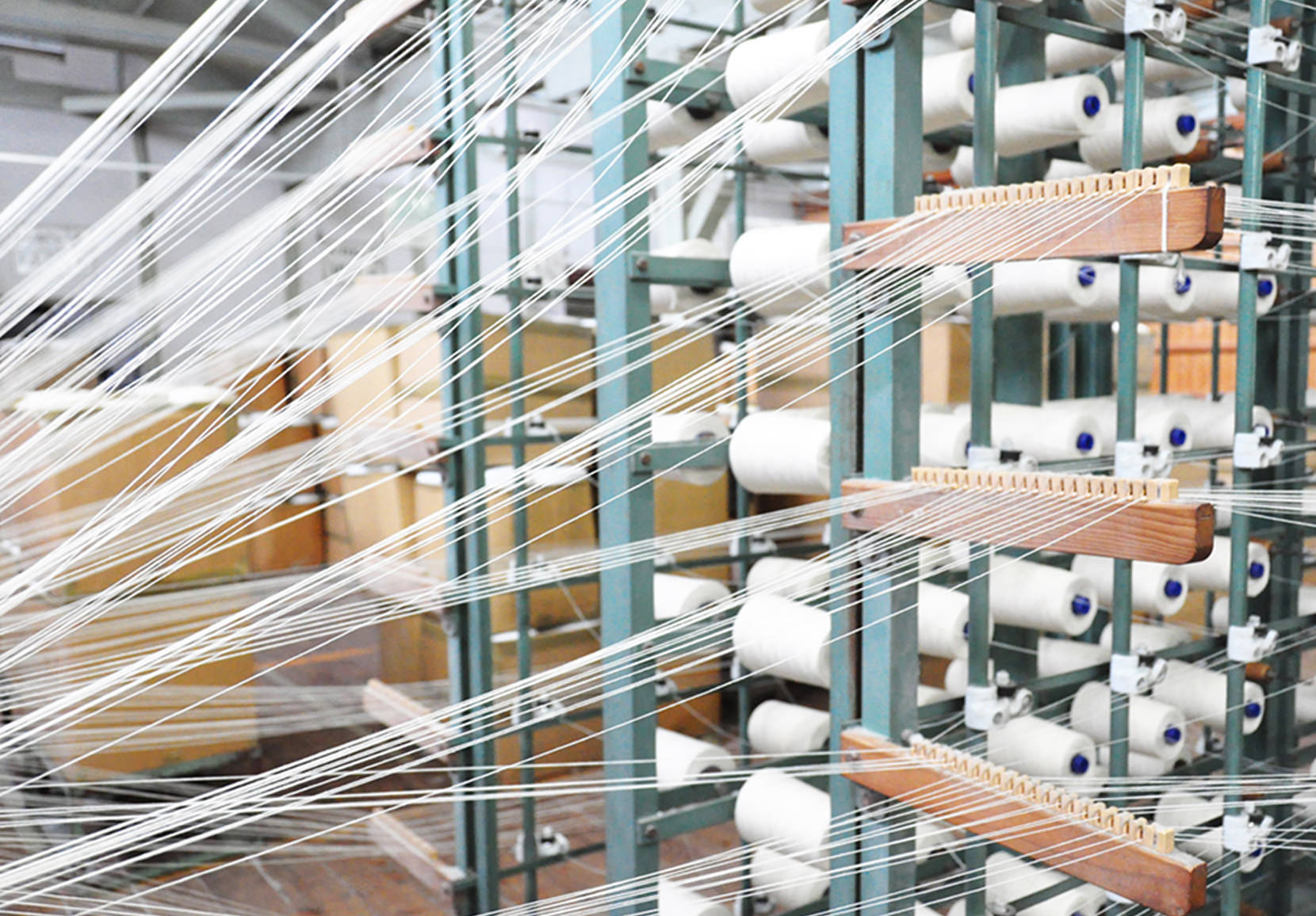 Many of our bags are made of special cotton canvas that has been treated with paraffin, a type of wax that repels water. The yarn in our canvas is made of combed cotton fibers. This yarn is very strong and firm because of the combing process, which selects the longest cotton fibers and makes them straight and clean before they are spun into yarn. This also gives the yarn a distinctive, lustrous appearance. Because it is woven with an old-fashioned shuttle loom, our canvas has a solid selvedge edge. The looms that makes our canvas have been working for 40 or 50 years. The beautiful selvedge is one unique point of our canvas, and we often use it as part of our designs.